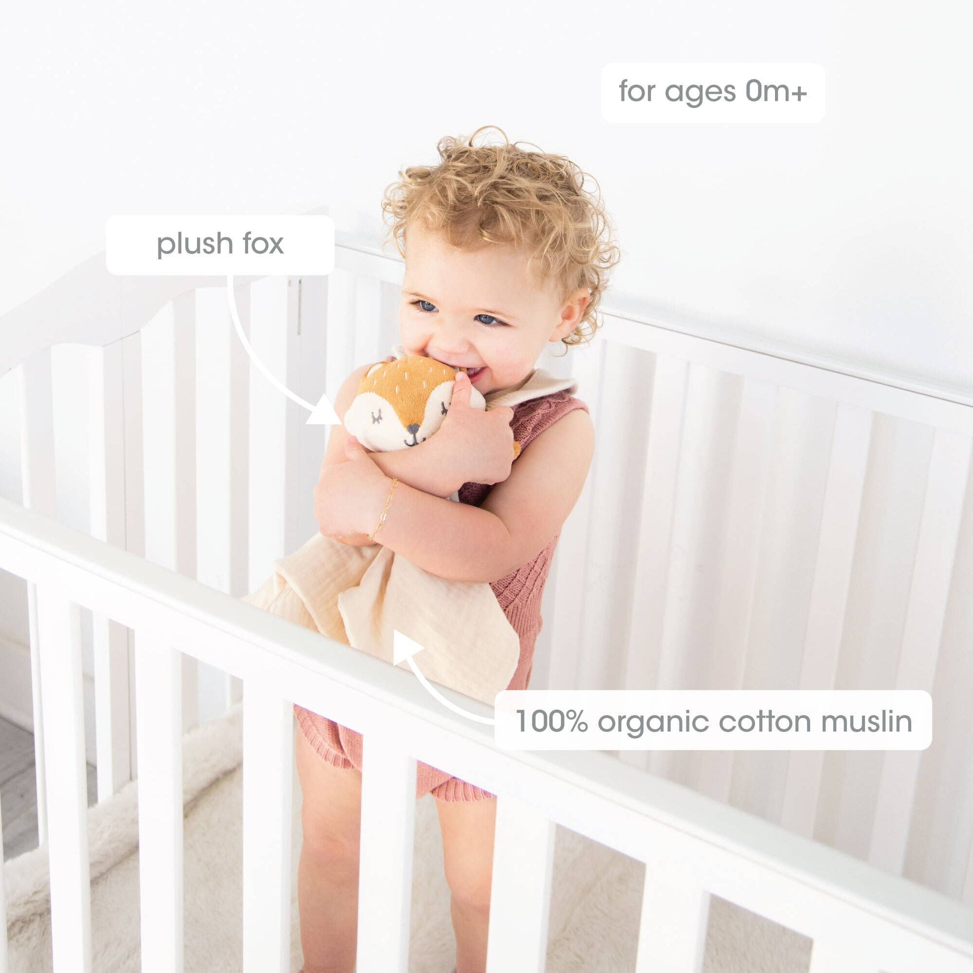 • Irresistibly Cute: Made with 100% organic cotton and cotton muslin, our modern snuggle toy features a neutral-colored plush orange fox head with movable arms and a soft, huggable muslin cream-colored blanket, it's friendly face is sure to capture your child's heart.
